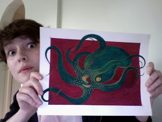 | here's a gouache squid that i sketched, painted, and inked entirely while under the influence of many many many rum and cokes. i am shocked at how well this came out. |